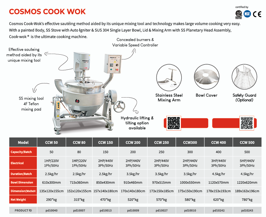 The Cosmos Cook-Wok is designed to simplify large-volume cooking through its efficient sautéing method and innovative mixing technology. It features a painted body and a stainless steel stove equipped with an auto igniter. The cooking bowl, lid, and mixing arm are made from SUS 304 single-layer stainless steel, and the mixing arm is powered by a planetary head assembly. Altogether, the Cook-Wok® stands out as the ultimate cooking machine.