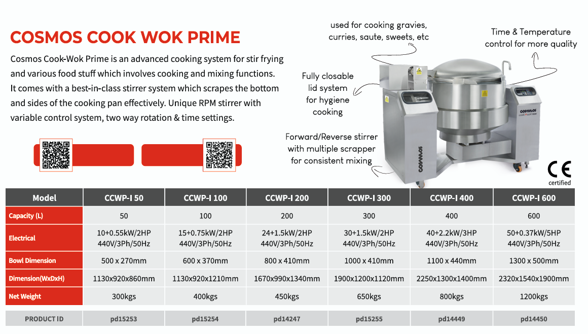 COSMOS Cook-Wok Prime is an advanced cooking system for stir frying and various food stuff which involves cooking and mixing functions. It comes with best-in-class stirrer system which scrapes the bottom and sides of the cooking pan effectively. Unique RPM Stirrer with variable control system, two way rotation & time settings.