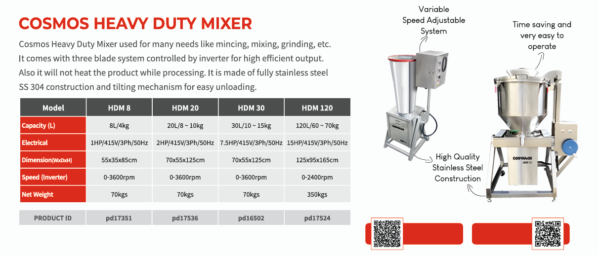 COSMOS - Heavy Duty Mixer used for many needs like mincing, mixing, grinding etc. It comes with three-blades system controlled by an inverter for high-efficiency output. It does not heat the product during processing. It is made of fully stainless steel (SS 304) construction and includes a tilting mechanism for easy unloading